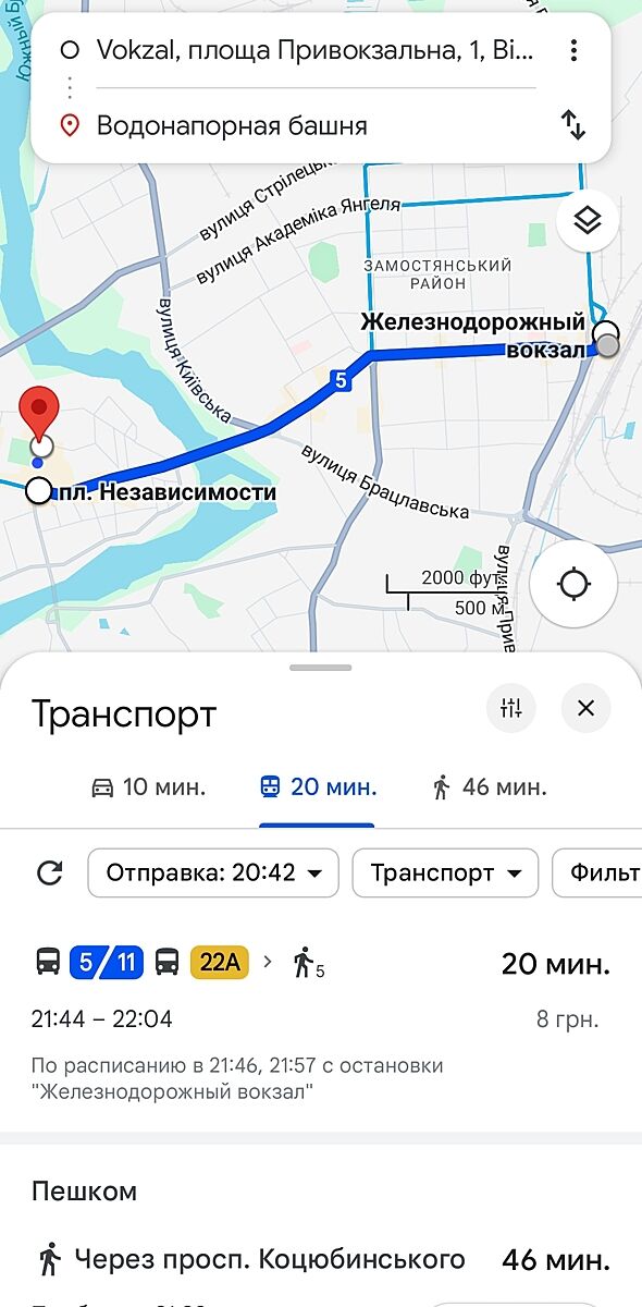 Біля вокзалу фонтан, там є заклади. Через міст пішки в центр зайдіть, погуляйте