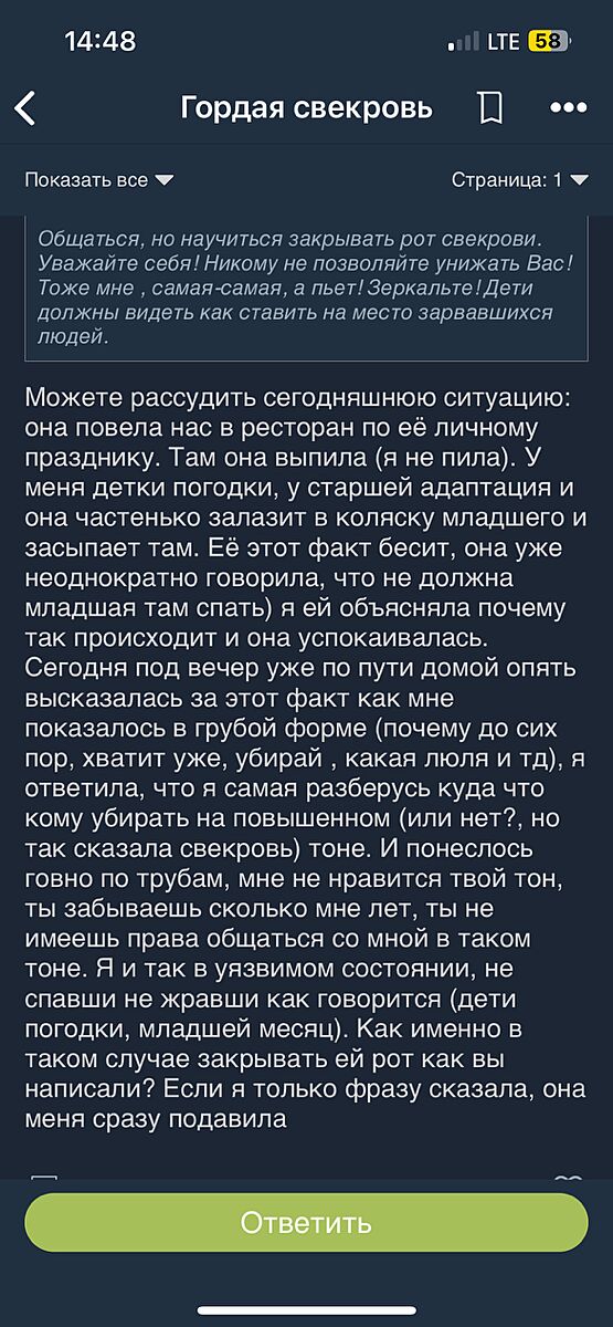 Если есть конфликт с гордой и властной свекровью, вы предпочтете: 1. Засунуть свое мнение в жопу и притвориться миленькой и извиниться помириться, НО в дальнейшем избегать встреч и разговоров. 2. Не мириться, но какое то количество времени быть в натянутых неприятных отношениях, и плюс дети будут видеть эти отношения, неприязнь. К слову ситуацию я тут уже описывала, фото добавлю. Ситуаций таких много, все раньше решалось через мужа, на фото описание самой последней ситуации