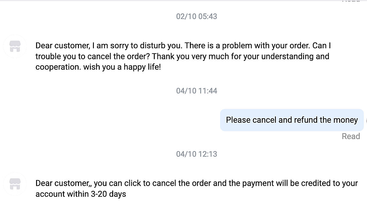 На них платформа накладає штрафні санкції за те що не відправлять або відмінять, тому вони просять покупців відмінити. В будь якому випадку нічого не робити, якщо час відправки пройде то вам автоматично повернуться кошти ще й можливо дадуть купон.