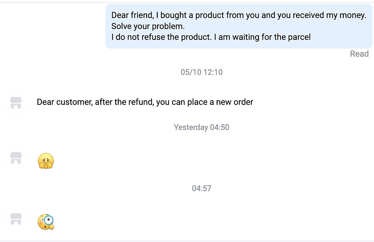 Я выполнила условия покупки, продавец не выполнил и шлет мне тупые смайлы в переписке