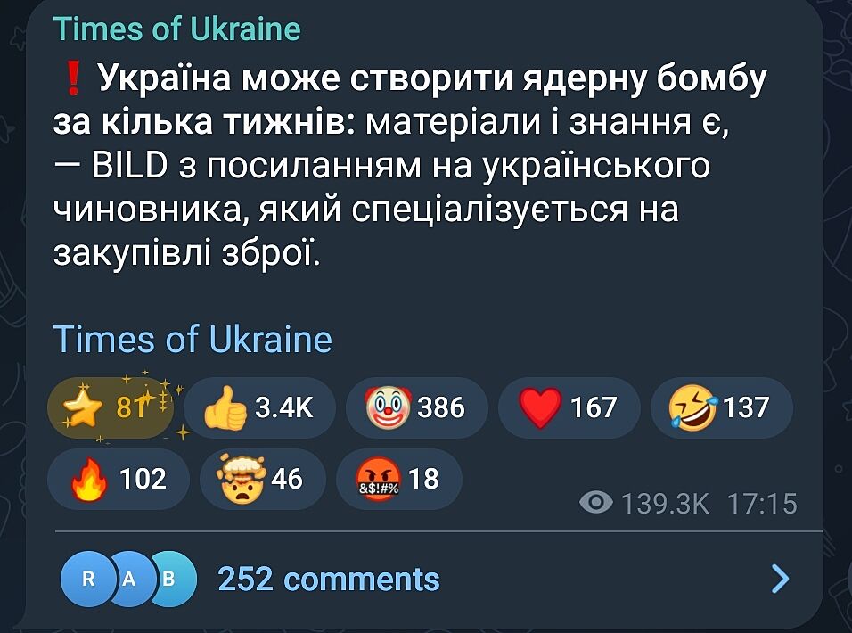 Так, він посилається на заяву високопоставленого українського чиновника, за словами якого, Україна не змириться з другим наступом російських військ на Київ, і в цьому разі буде відновлено український ядерний арсенал, від якого країна добровільно відмовилася в 1990-ті під час підписання Будапештського меморандуму.
