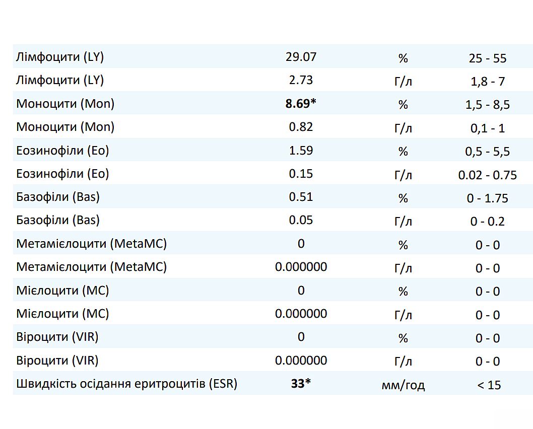 GPTПідвищений рівень моноцитів та нейтрофілів, а також значно підвищена ШОЕ, що може свідчити про наявність запального процесу або інфекції.