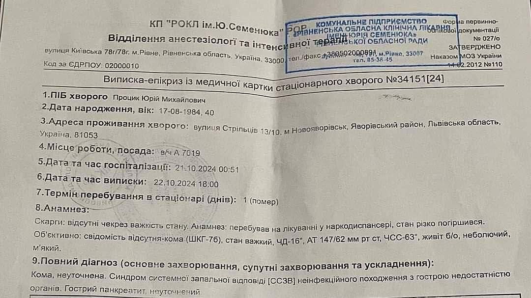 Впоследствии родные восстановили события: Юрия сперва доставили в наркодиспансер, а оттуда он попал в больницу в состоянии комы. По официальной версии - новобранец скончался 22 октября.. от острого панкреатита.