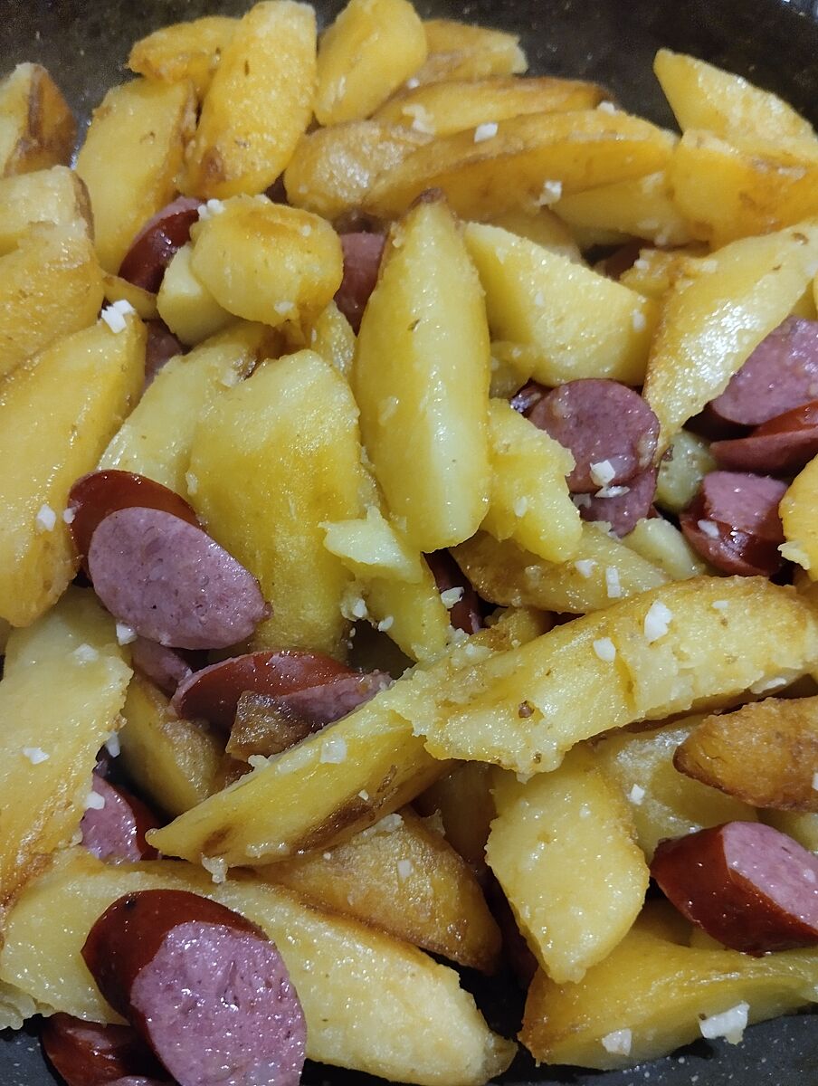 Сьогодні те, що було в холодильнику. Картопелька смажена с кабаносами та часничком. Сподіваюсь сусіди не винесуть двері😆