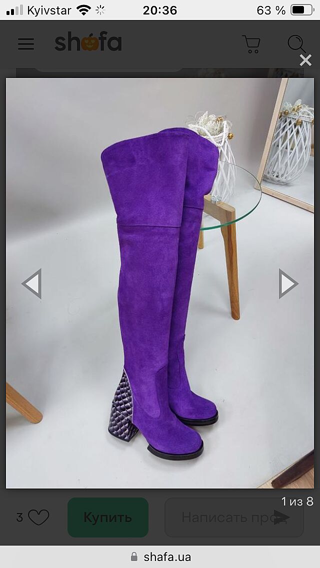 Не могу найти ,на пром.юа , под фиолетовую курточку хочу такие же сапожки на каблучке или платформе ,высота выше колен , можно ботфорты