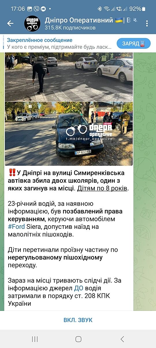 Город Днепр ,сегодня возле гимназии ,в которой учится моя дочка ,23 летний водитель сбил троих детей на пешеходном переходе возле школы, один ребёнок погиб ,двое в больнице .