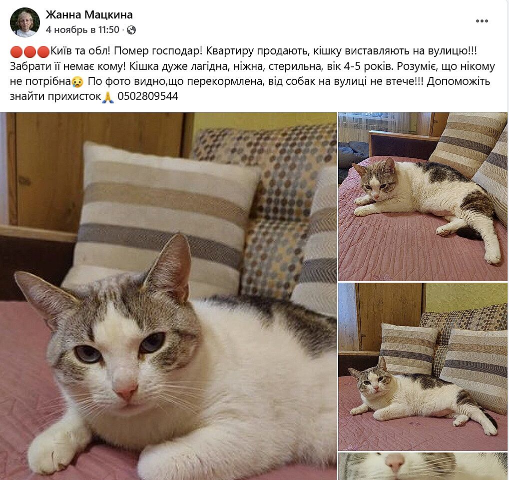 Вам так жалко кошку-покажите пример и возьмите ее себе. Вот в таких ситуациях я все больше понимаю, что только породистых животных надо заводить-в случае смерти хозяев или заводчик заберёт или клуб пристроит животное. Но эти животные стоят очень хороших денег и за них ответственность нести надо.