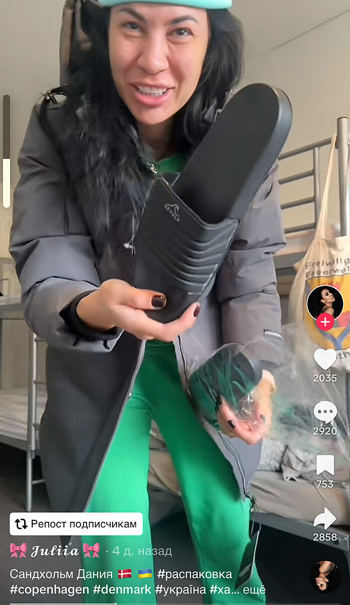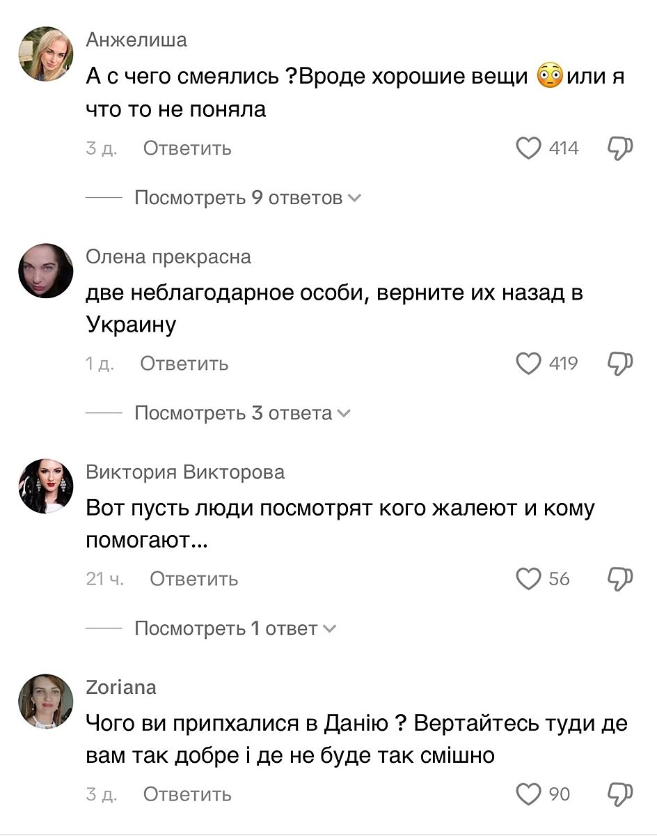 Попалось відео на Тік-ток, як наша біженка, особа з Харкова, розмістилися в таборі Данії, отримала гуманітарну допомогу, яку дають по приїзду в табір, і висміювала речі і то все на камеру( з подружкою.