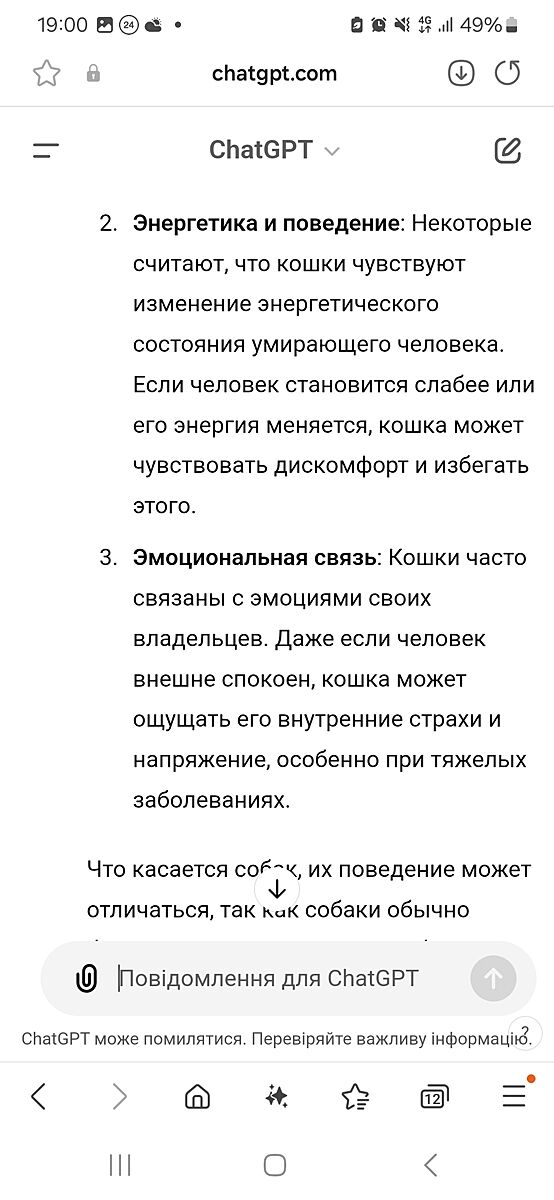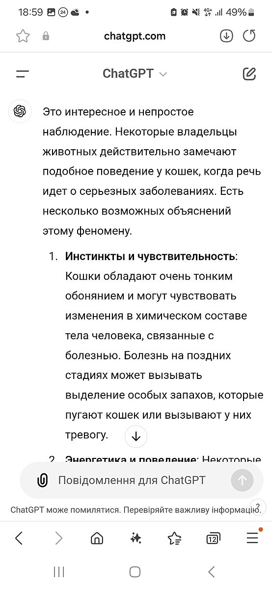 Не раз замечала такую штуку на родственниках. Да, если там нога болит просто или желудок, то может лечь рядом помурлыкать, но вот был один с раком на терминальной стадии, и вроде лежит спокойно, не кричит, не размахивает руками-ногами, а его же кошка прячется в угол. Так странно! Второй с инсультом, и любимая кошка. Сколько дочка не пыталась укладывать кошку рядом, она как-будто чего-то боялась, хотя до болезни все время с ним спала в обнимку. Не могу объяснить это..