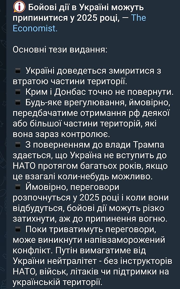 Ви читали план Зеленського, який він представив Трампу? Ми віддаємо в розпорядження їм всі ресурси країни, в обмін на їх допомогу і вступ до НАТО. Крім того, наші військові повинні будуть захищати інші країни ЄС. Розкрийте очі, за нас йде боротьба між двома акулами, ми нічого не вирішує вже давно.