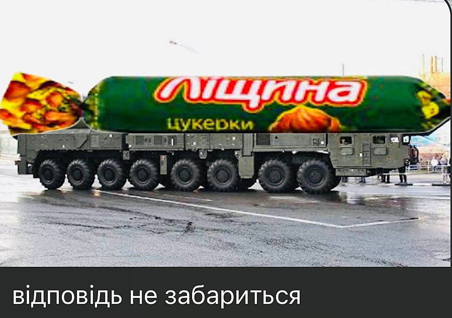 боже як страааашно.единственную ночь спать не буду.путин ну накера ты нас так напугал орешником фундуком.святая наивность- к него ракеты есть и больше ни у кого нет.как и потерьнет и сво идет по плану а как ’сбили’все 12 ракет на курск мы видели в прямом эфире от местных корреспондентов).ото брехло
