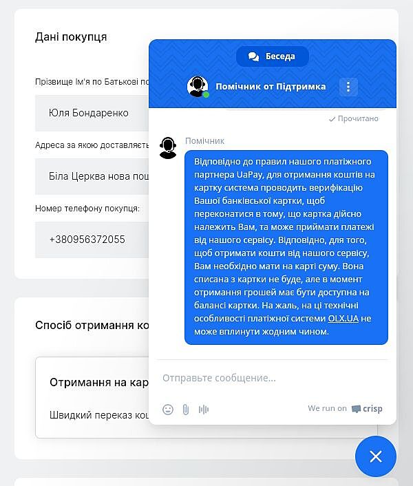 Поддержка олх пишет - это не мы! Это шахраи! Нам не важен баланс карты!