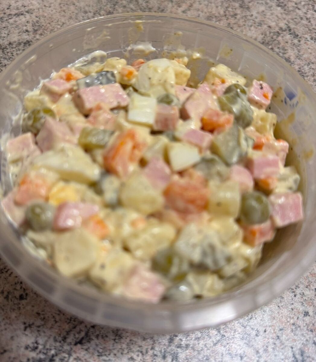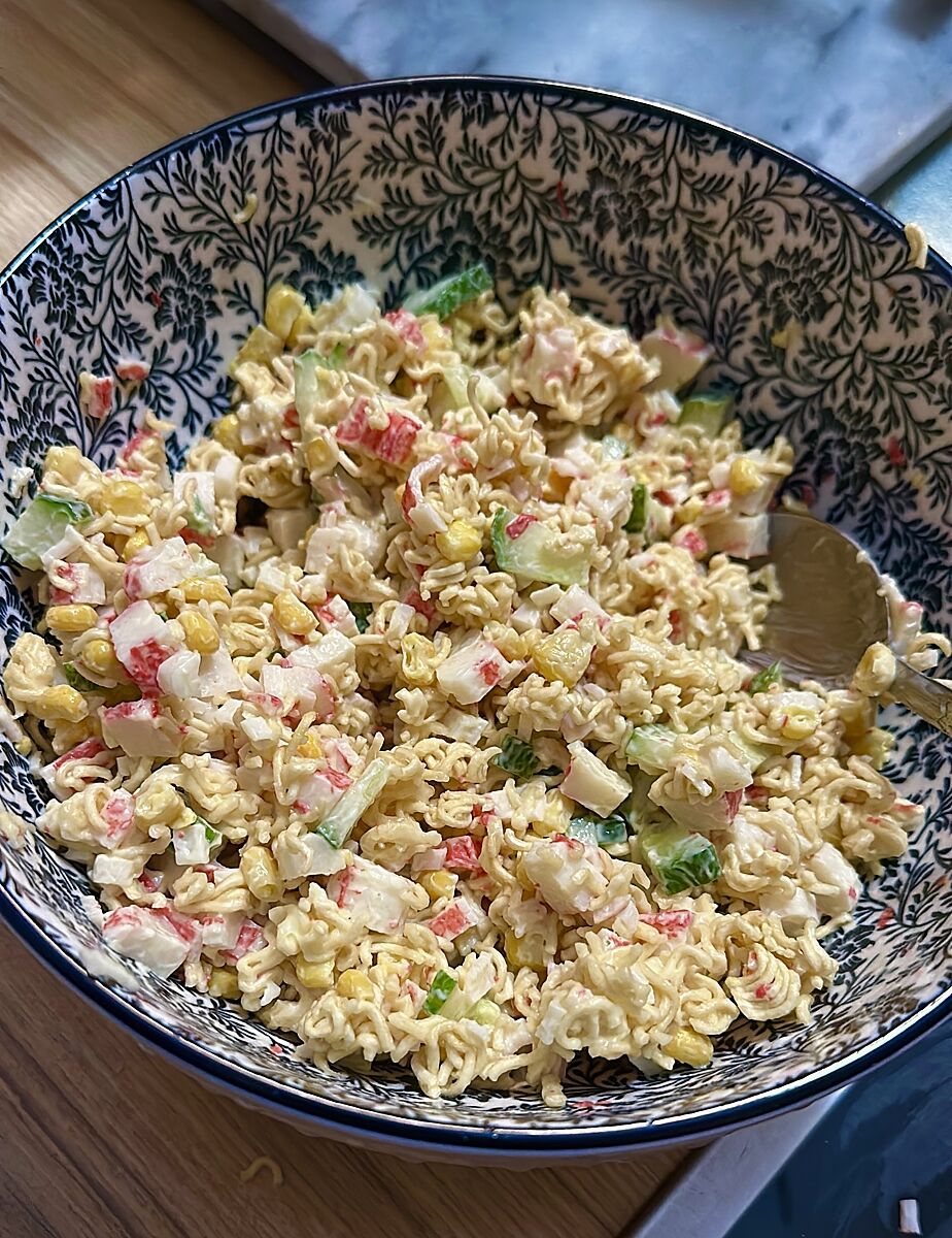 Салат: крабові, кукурудза, пекінка, фіолетова цибуля, сухарики, огірок свіжий. Заправку цього разу робила більш корисну: майонез напополам з сметаною, потерла ще туди сол огірок на мілкій тертці, діжонську нірчицю додала і трохи солі. Дуже смачно. Мала дуже любить. Але з сьогоднішніми цінами не дешево. Сьогодні рахували собівартість, то близько 230 грн виходить) Крабові різала напополам впоперек, і кожну частинку ще напополам але впродовж і потім соломкою. Так гарна тоненька соломка виходить)