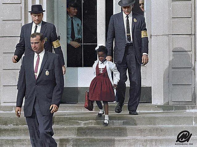 Вот на фото 1960 год, первый ребёнок который идёт в школу для белых. С охраной
