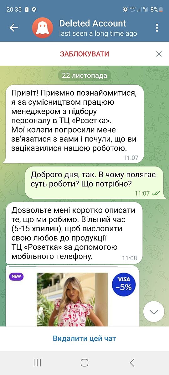 через телеграм, была реклама, кто хочет подзаработать выполняя не сложные задания, я ответила, меня перенаправили на какого то администратора, он выложил утром задания - написать на Розетке отзывы и ссылки на вещи, я написала они кинули на карту 140 грн., потом следующее задание купить по три вещи на той же Розетке, типа потом их можно сдать и вернут деньги, там был плед, сервиз и еще что-то...не помню, не дочитала просто написала, что очередной лохотрон и такая ’работа’ мне не интересна и заблокировала всю эту шайку.