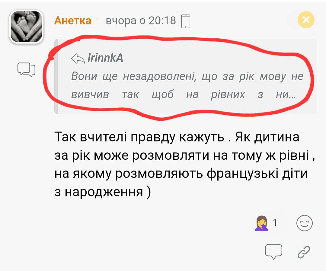 Вони ще незадоволені, що за рік мову не вивчив так щоб на рівних з ними розмовляти. А дітям моїм вчителі люблять іноді казати, що: ’так, ти звичайно добре розмовляєш, але ти не француз і це не твій langue natale. В січні зустріч і з професорами планується. Буду розмовляти, щоб так не говорили. Це треш якійсь.