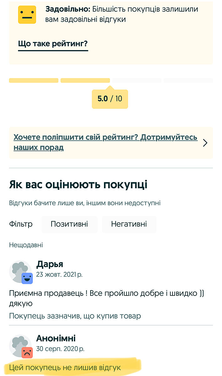 Тю. Я там майже нічого не продала і не купила з моменту початку рейтингу. І мала чомусь рейтинг «задовільно». Така собі система