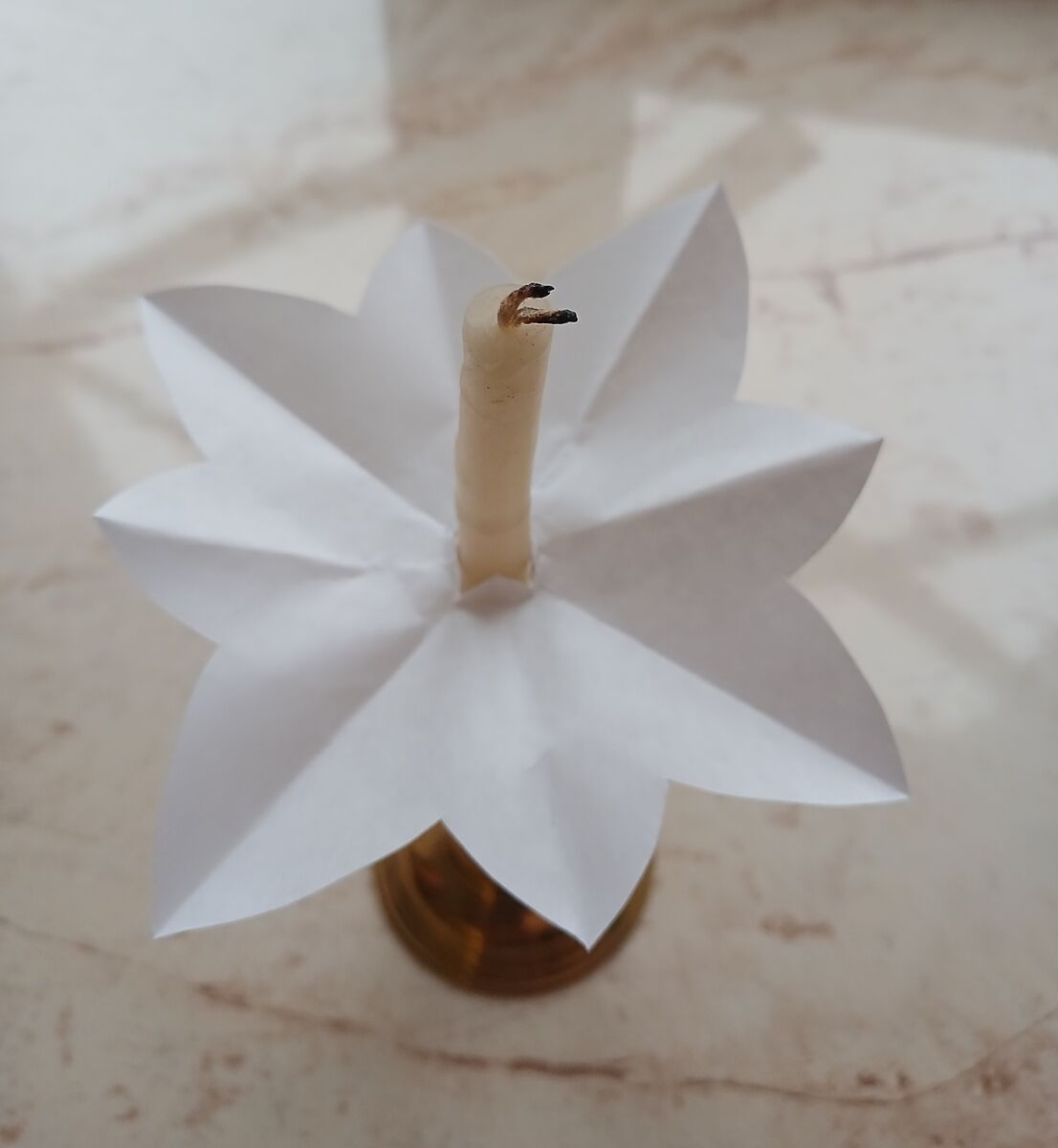 купите носовой платочек с кружевным краем и оберните вокруг свечи, если нет другого варианта, а вообще в церквях вырезают из сложенного несколько раз листа бумаги цветок (самый простой, на 6-8 лепестков) так же, как если бы вырезали снежинку, а в его центре делают небольшой (по диаметру свечи) надрез крест-навкрест и вставляют в него свечу, получается барьер, сохраняющий руку от горячих капель воска