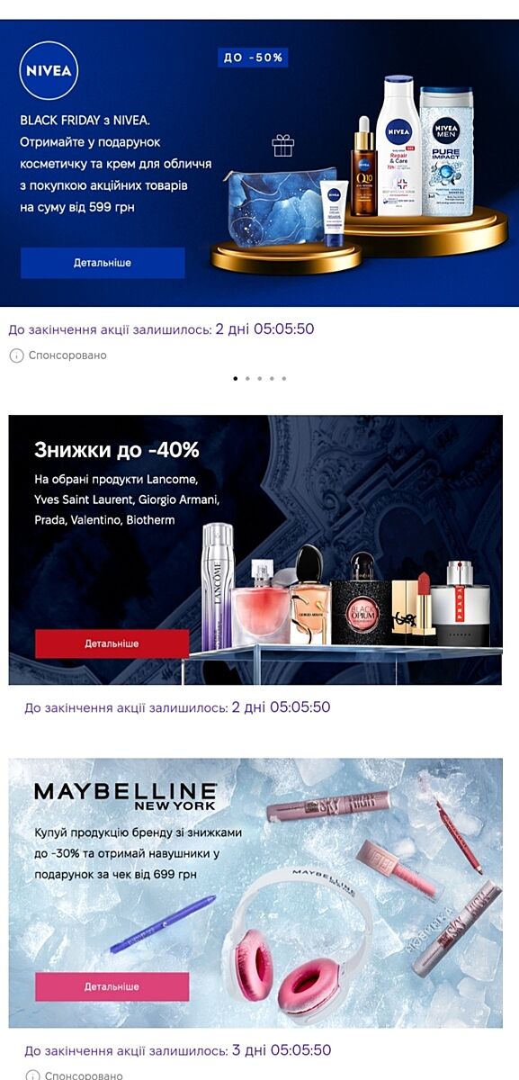 А, и там сейчас до 40% на акційні товари Lancome, Yves Saint Laurent, Giorgio Armani, Biotherm, Prada та Valentino
