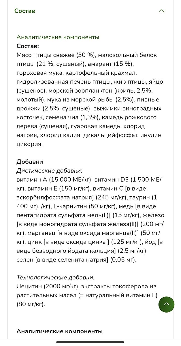 Для холистика как-то странно, что указаны общие понятия ’мясо птицы’, ’жир птицы’. Птица - это и голубь, и страус, и курица. За +- те де деньги возьмите лучше Orijen.
