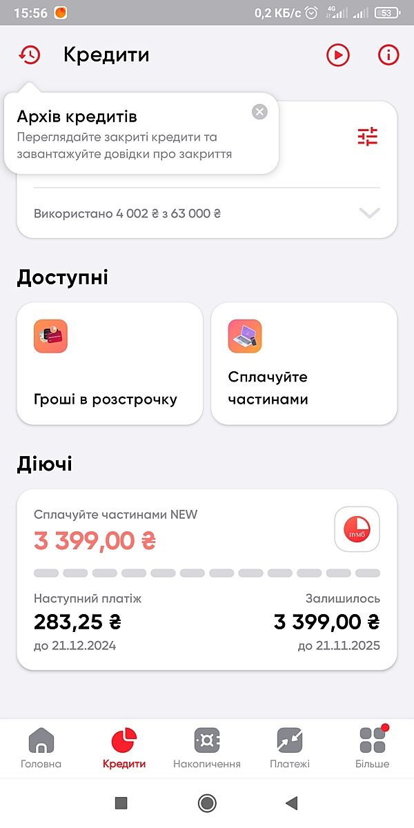 Рубрика Кредиты, три полосочки и к положенной дате вносите платеж. Если сами не вносите, пумб сам списывает платеж с карты, к которой привязан счёт, но там должен быть плюс . Но лучше самой платить. Если что непонятно, звоните им на горячую линию, или пишите им через приложение. Вот на скрине Вашем, нажимаете на тот кредит и вносите платеж 280 грн