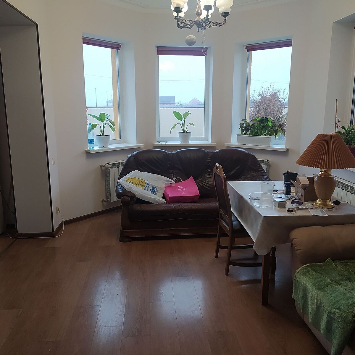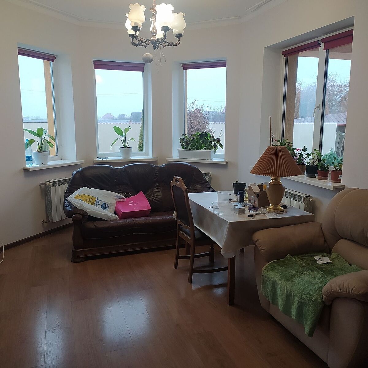 Тюль до підлоги просто білу. Я б стіл поставила по центру, навкруги крісла. Скатертину поміняти. Диван там де стіл далі трохи. Але не видно всієї кімнати. Люстру теж би змінила. Біля диван килимок і маленький столик