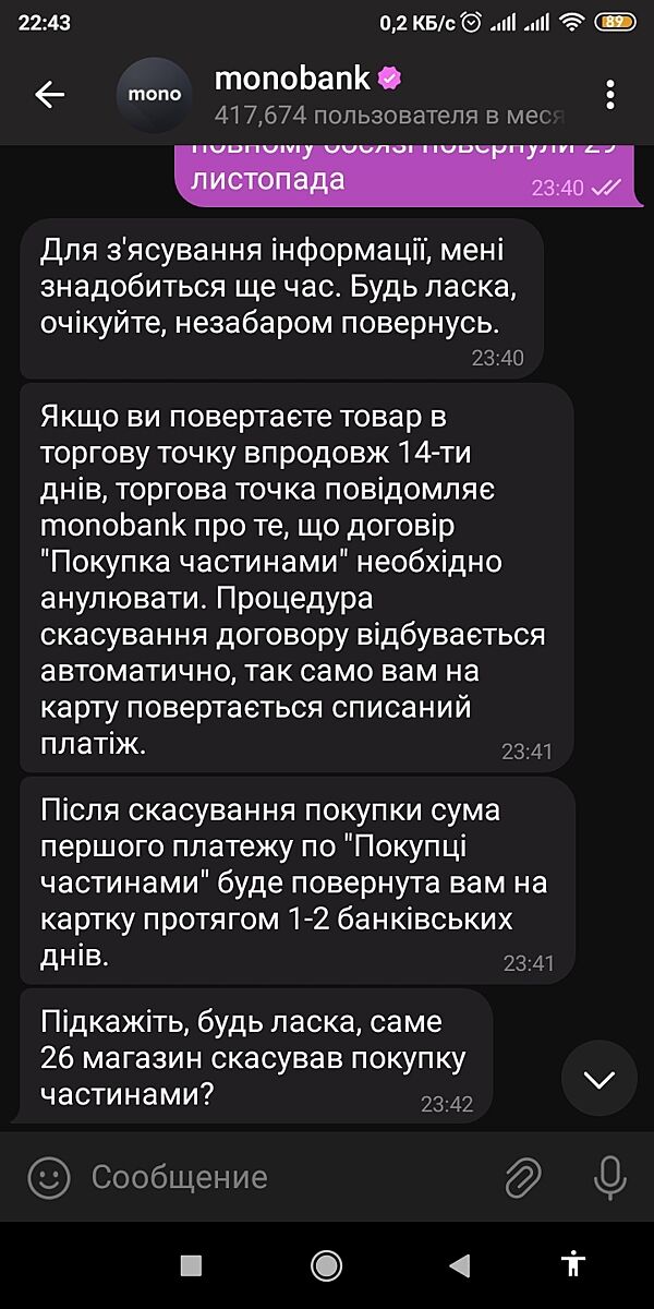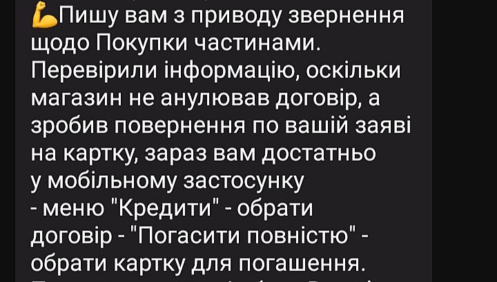 Як відбувається процес повернення товару, придбаного послугою оплата частинами? В мене ситуація наступна: я купила товар, мені не він не підійшов, повернула товар у наступні кілька днів, розетка повернула мені кошти за сам товар. Але договір Розетка не розірвала оплати частинами і в мене все ще діє активована оплата щомісяця в додатку монобанк "кредити". Працівник на точці видачі каже цітую: що розетка повертає кошти і ціми коштами ви повертаєте кредит який ви брали" . Але це виплачується Розетці - "RozetkaPay" у розділі "кредит". У чому сенс, я не розумію?Це позначає так: я купую товар->я повертаю товар–>розетка повертає мені гроші–>мені потрібно віддати кошти за те, що я повернула товар? сплатити повітря? Я запитала у телеграм-підтримці Монобанк чому договір все ще діє, якщо я зробила повернення. Відповідь наступна(1 скрін). Я чекаю 4 дня, тиша, я знову пишу у підтримку, отримаю вже іншу відповідь:(2 скрін). Поясніть будь ласка