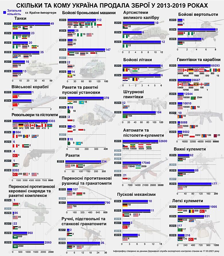 Стокгольмский институт исследований проблем мира (SIPRI)дал отчет,сколько оружия и техники УКРАИНА ПРОДАЛА в 14-19 годах .В 2014 году основную часть экспорта оружия Украины снова составили винтовки и карабины – 28 тыс. 667 штук: Канада купила 10,4 тыс. штук, США – 10 тыс. 166, Чехия – 5 тыс., Уганда – 3 тыс., Грузия – 100, ДРК – одну.