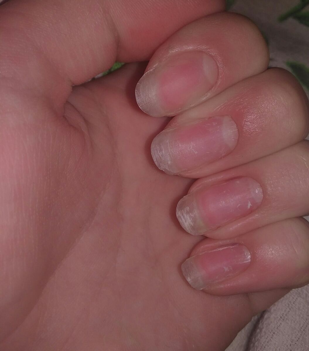 Но когда снимаю фрезой кукуруза, ногти стали как тряпочки и прозрачные, аж синие. Теперь укрепляю всем подряд.
