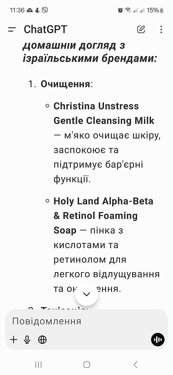 Спочатку розписав мені догляд майже весь аптечна косметика. Попросила професійну - написав валмонт і т.д. Потім попросила Ізраїль і доглядові в косметолога. Так все конкретно розписав, що коли і як. Просто частина з приклвду на скріні.