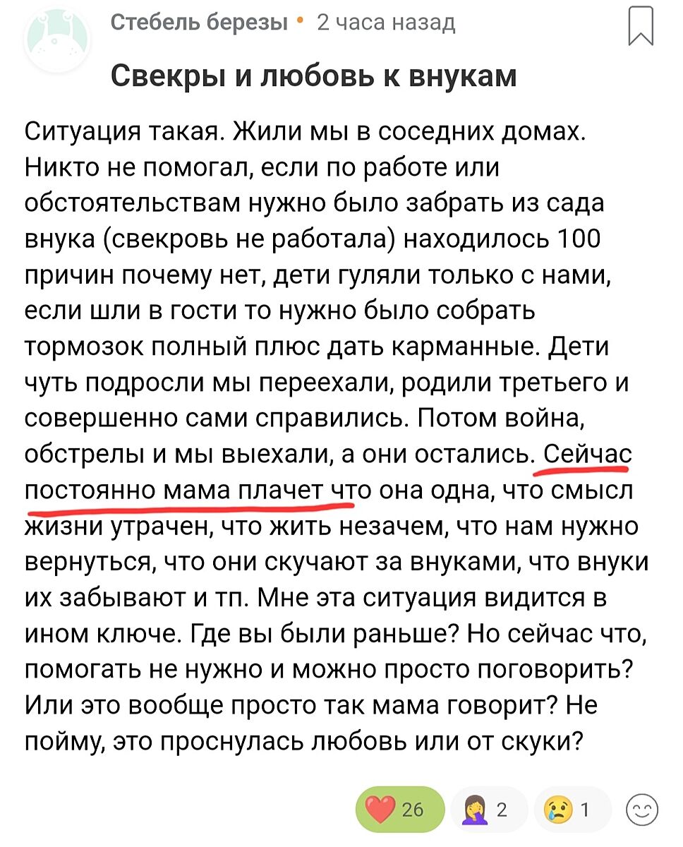 Ситуация такая. Жили мы в соседних домах. Никто не помогал, если по работе или обстоятельствам нужно было забрать из сада внука (свекровь не работала) находилось 100 причин почему нет, дети гуляли только с нами, если шли в гости то нужно было собрать тормозок полный плюс дать карманные. Дети чуть подросли мы переехали, родили третьего и совершенно сами справились. Потом война, обстрелы и мы выехали, а они остались. Сейчас постоянно мама плачет что она одна, что смысл жизни утрачен, что жить незачем, что нам нужно вернуться, что они скучают за внуками, что внуки их забывают и тп. Мне эта ситуация видится в ином ключе. Где вы были раньше? Но сейчас что, помогать не нужно и можно просто поговорить? Или это вообще просто так мама говорит? Не пойму, это проснулась любовь или от скуки?