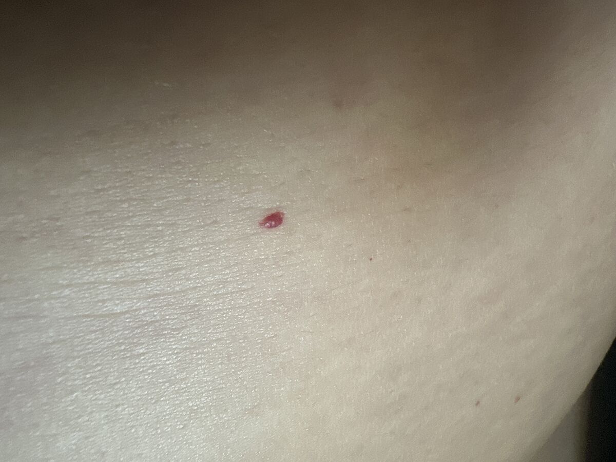 Похожа на ангиому. С ними к дерматологу. Если не мешает, то , обычно,их просто не трогают. Если не нравится/ мешает- удаляют. Но ангиомы появляются снова