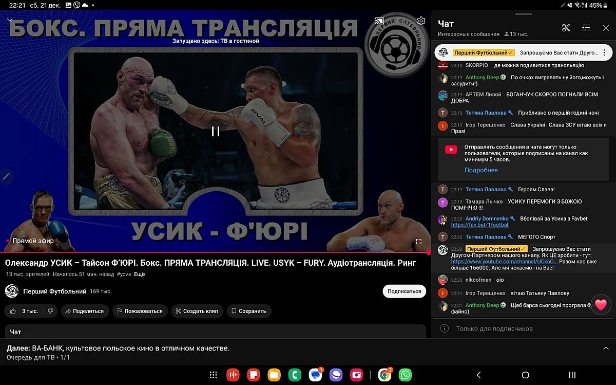 Я на ютуб пошла, пока идет какой бой , но на экране его нет . Только звук и комент . Надеюсь бой Усика будет .