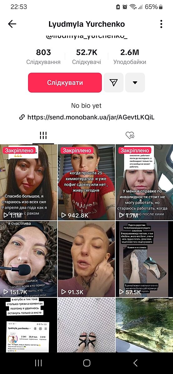 Я була підписана на іншу онкохвору. на жаль, її вже нема. Але там були прямі відео з лікарні, скріни діагнозу