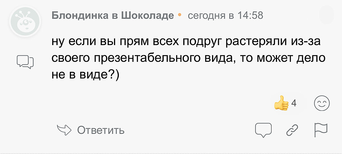 Слушайте, не надо меня газлайтить) Совершенно очевидно вы утверждаете, что я писала как потеряла подруг из-за внешнего вида, а я не писала, можете тему перечитать)) Проблемы здесь не у меня.