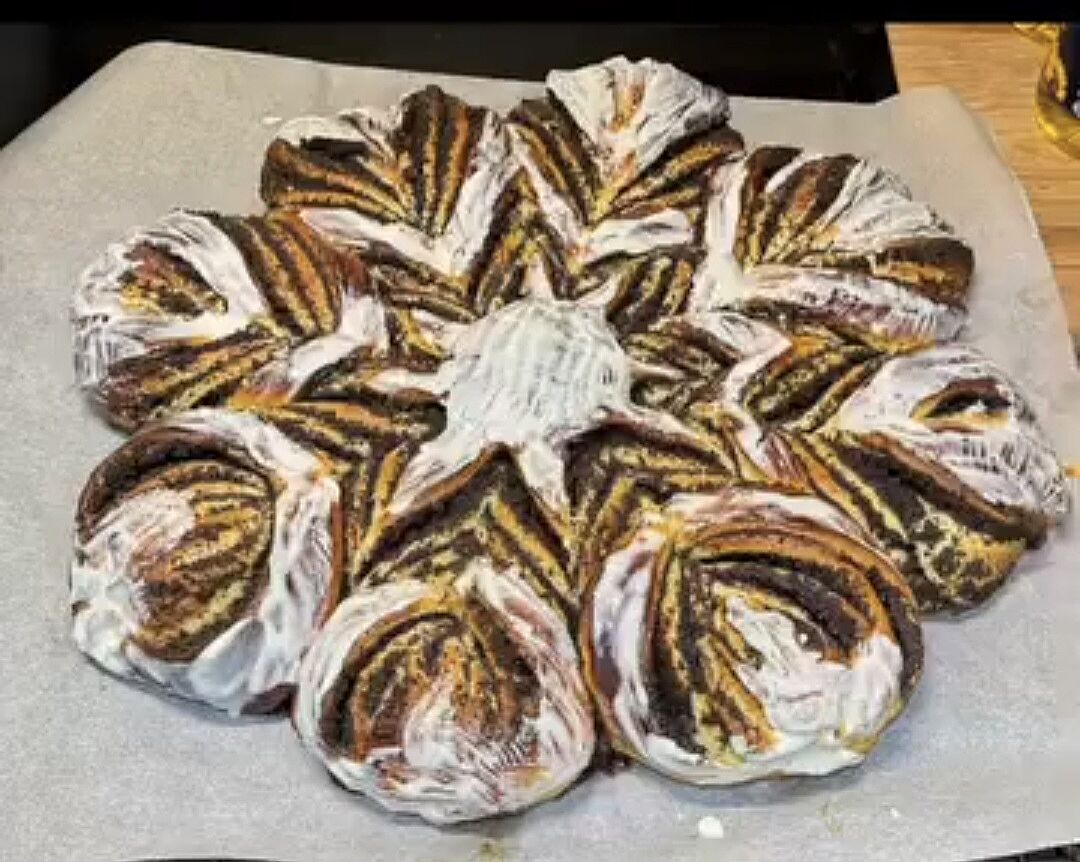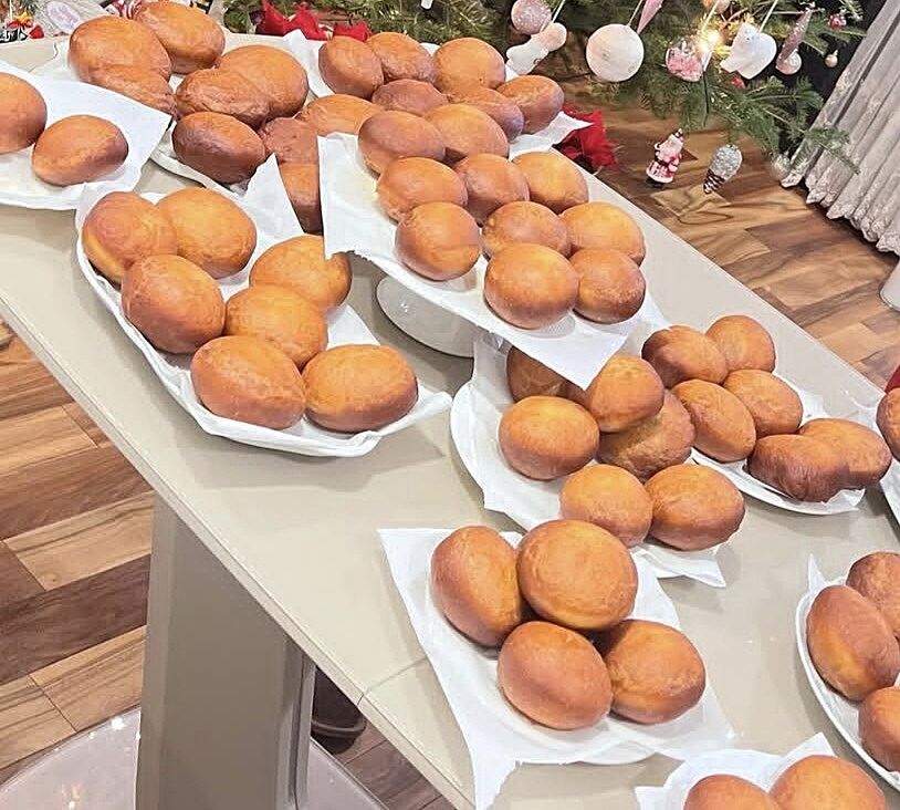 Борщ з вушками, равіолі з омаром, равіолі з рікотою, лосось у вершково шпинатному соусі, узвар, салатка яжинова - це брат нашого Олівʼє, але без мʼяса. Бутерброди з ікрою. У нас інтернаціональна сімʼя, тому такий вибір, ще капуста квашена, грибочки мариновані.
