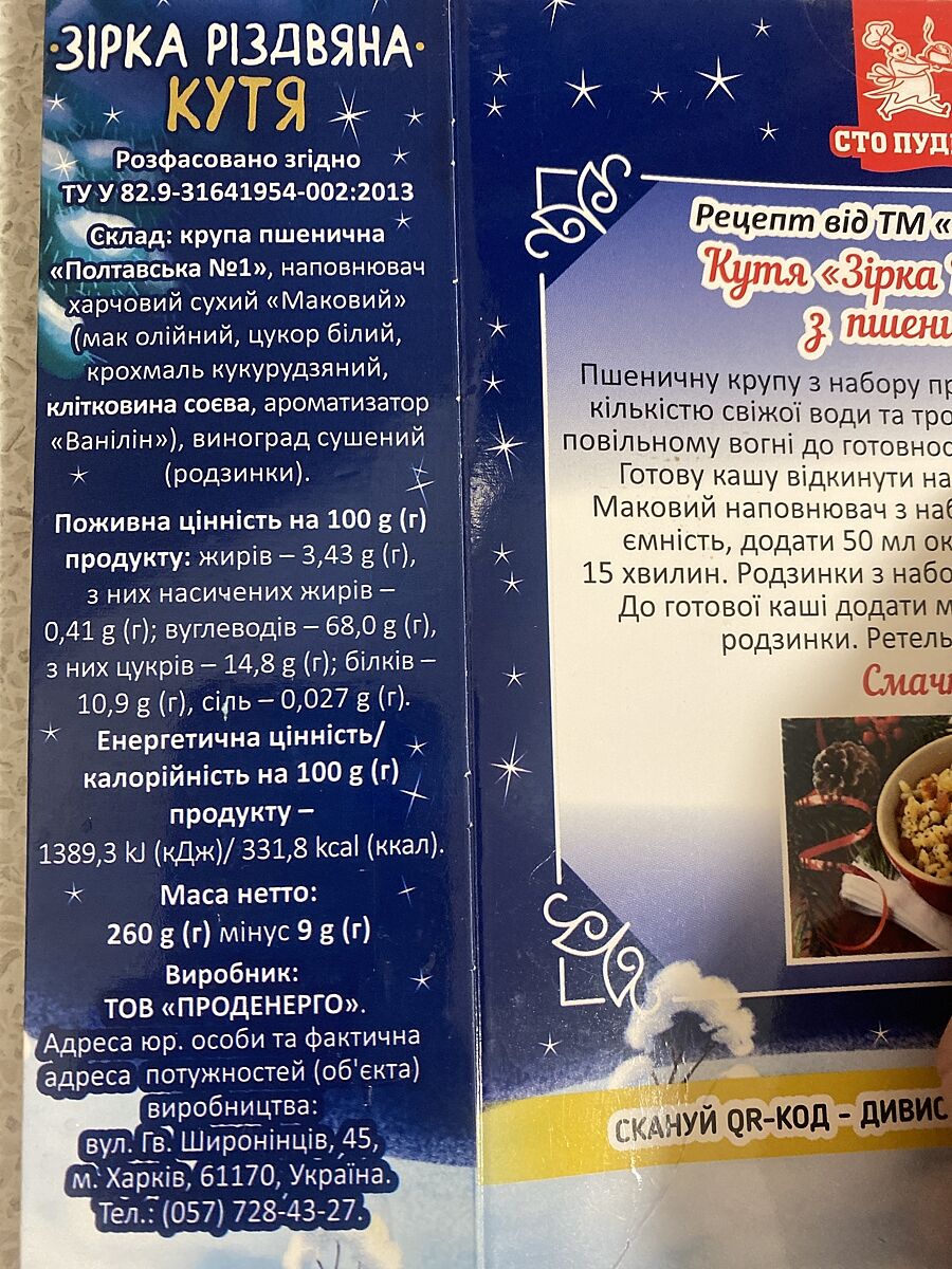 Вчора обійшла купу магазинів і не змогла купити кутю. Сьогодні чоловік приніс пачку, зварила. Пшениці виходить досить багато. Родзинок поклали грам 30, може й менше. Мак сухий з якимось підсолоджувачем, теж грамулька Не знаю, може завжди так, але раніше мак я брала пачкою і запарювала його, потім блендером. Не сама смачна кутя вийшла на виході. Але зважаючи на те що не купила завчасно, то добре що хоч цю знайшла