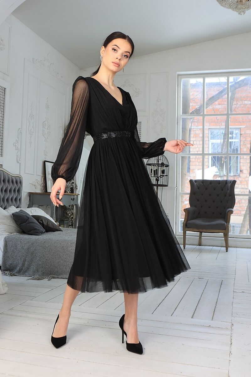 Черную юбку миди, можно с красивым разрезом + блузка или свитер нарядный. Или черное платье футляр. Это чтоб был элегантный образ. Сапоги выбросить, вульгарно да с этим платьем так вообще