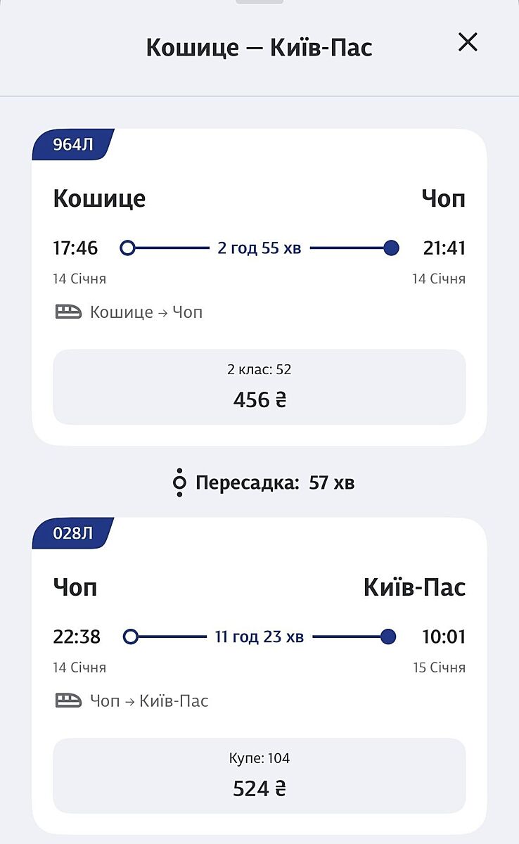 Потяг Кошице-Київ з пересадкою в Чопі