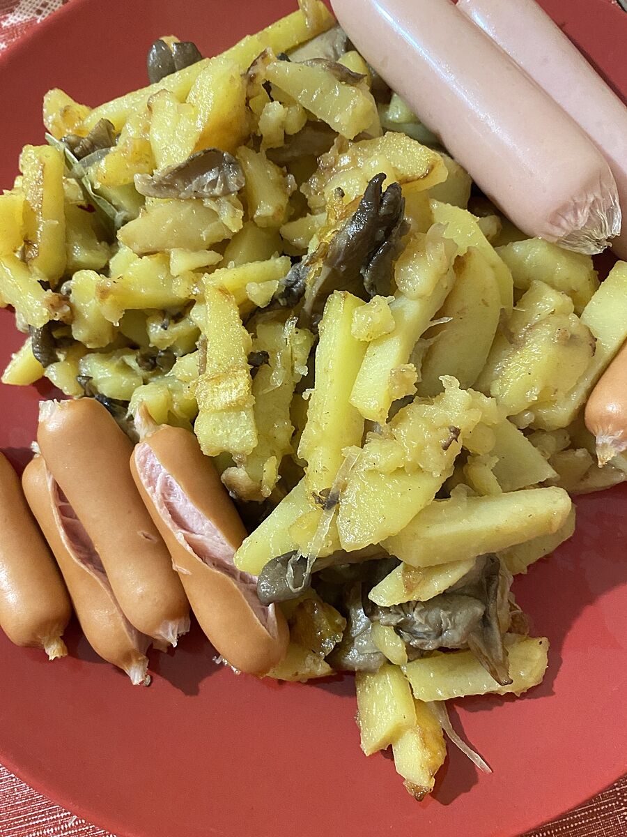 Жареная картошка с вешенками и два вида сосисок) праздника не было, просто впервые за 2,5 года картошку пожарила (это тоже можно считать праздником)))