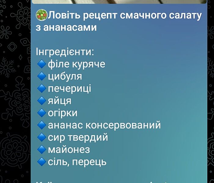 Я роблю ананаси шматочками, копчене куряче філе кубиками, сир кубиками та мариновані печериці. Заправляю майонезом, без цибулі та часнику, виходить дуже ніжний салат