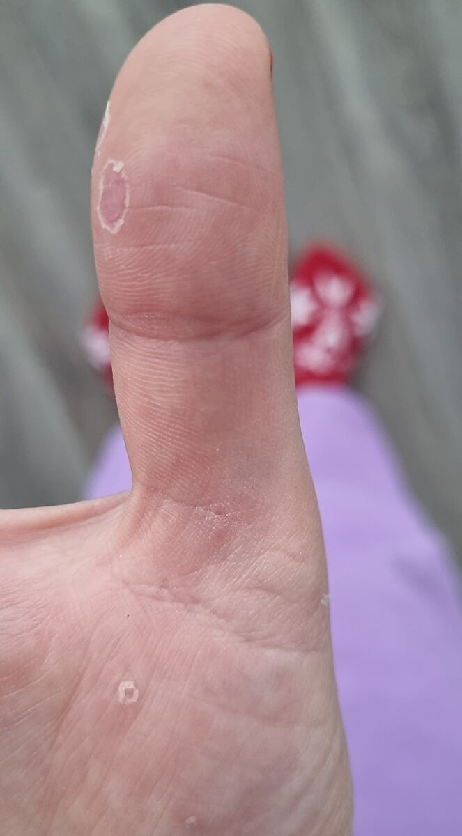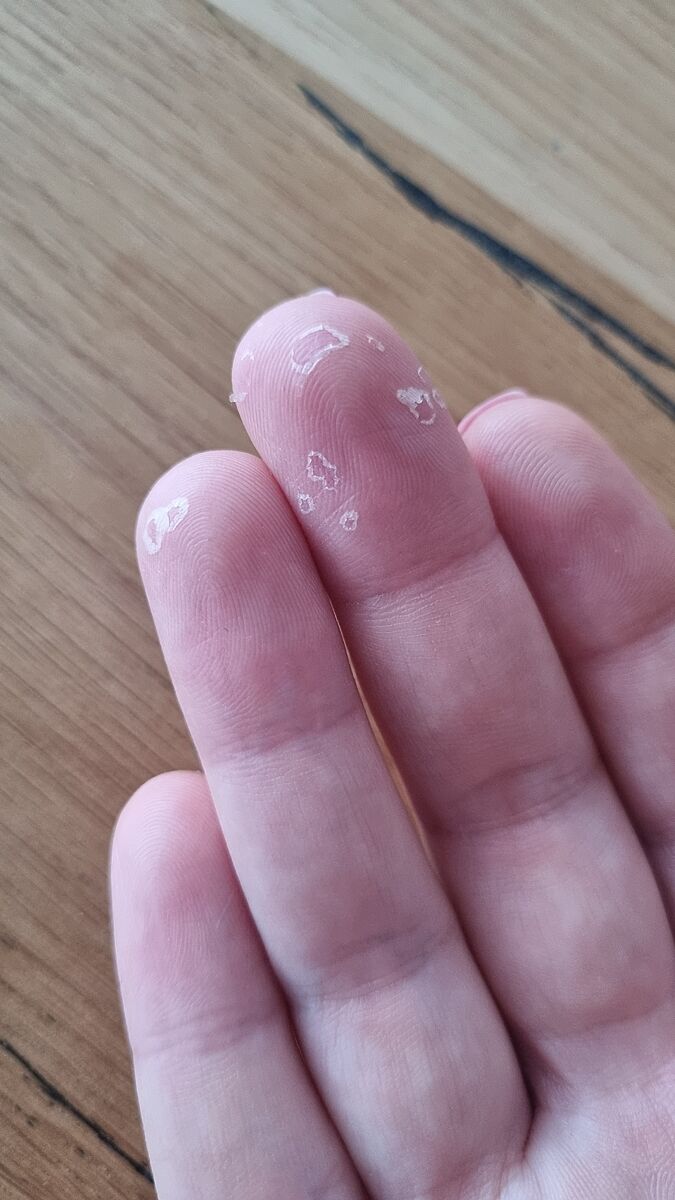 На тих пальцях, де нема ще такого, шкіра на подушечках втрачає чутливість.