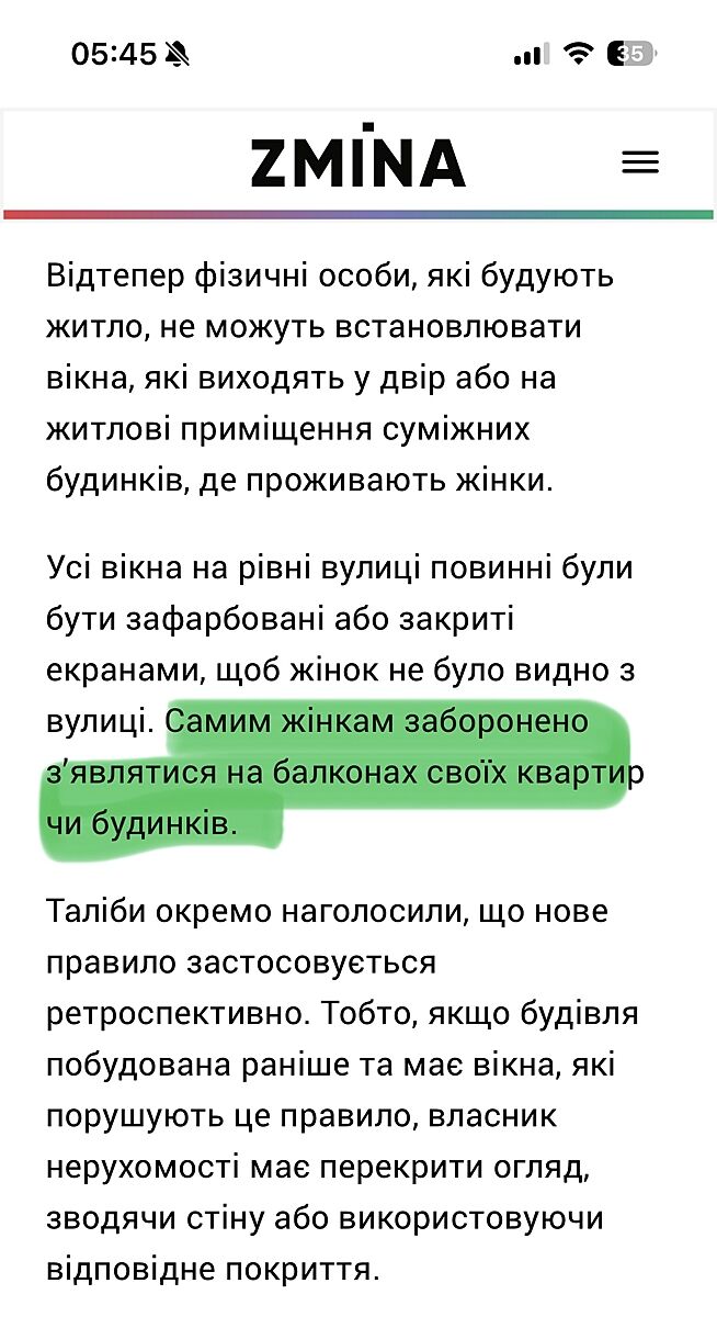 Начала искать информацию, не знаю как это возможно, но в октябре им запретили общаться мужду собой (женщина - женщина) и петь нельзя не только в общественных местах, но и дома, а также говорить тихо только с мужем и детьми и больше ни с кем. Я в ах***. Это получается и с родственниками что ли нельзя говорить. Как делиться информацией женщинам..