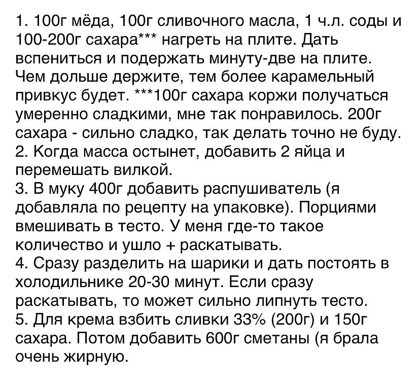 Мне вот такой нравится, но там есть моменты. Не грейте долго мёд с содой - может получится приторно карамельным. Если добавить чуть соли (пару щепоток), вкус чуть прикольнее. И на крем на такое количество теста брать 500мл сливок 33%, 600г сметаны и 150г сахара - тогда в меру сладкий. Ванильный сахар по вкусу.