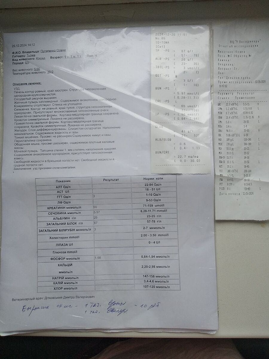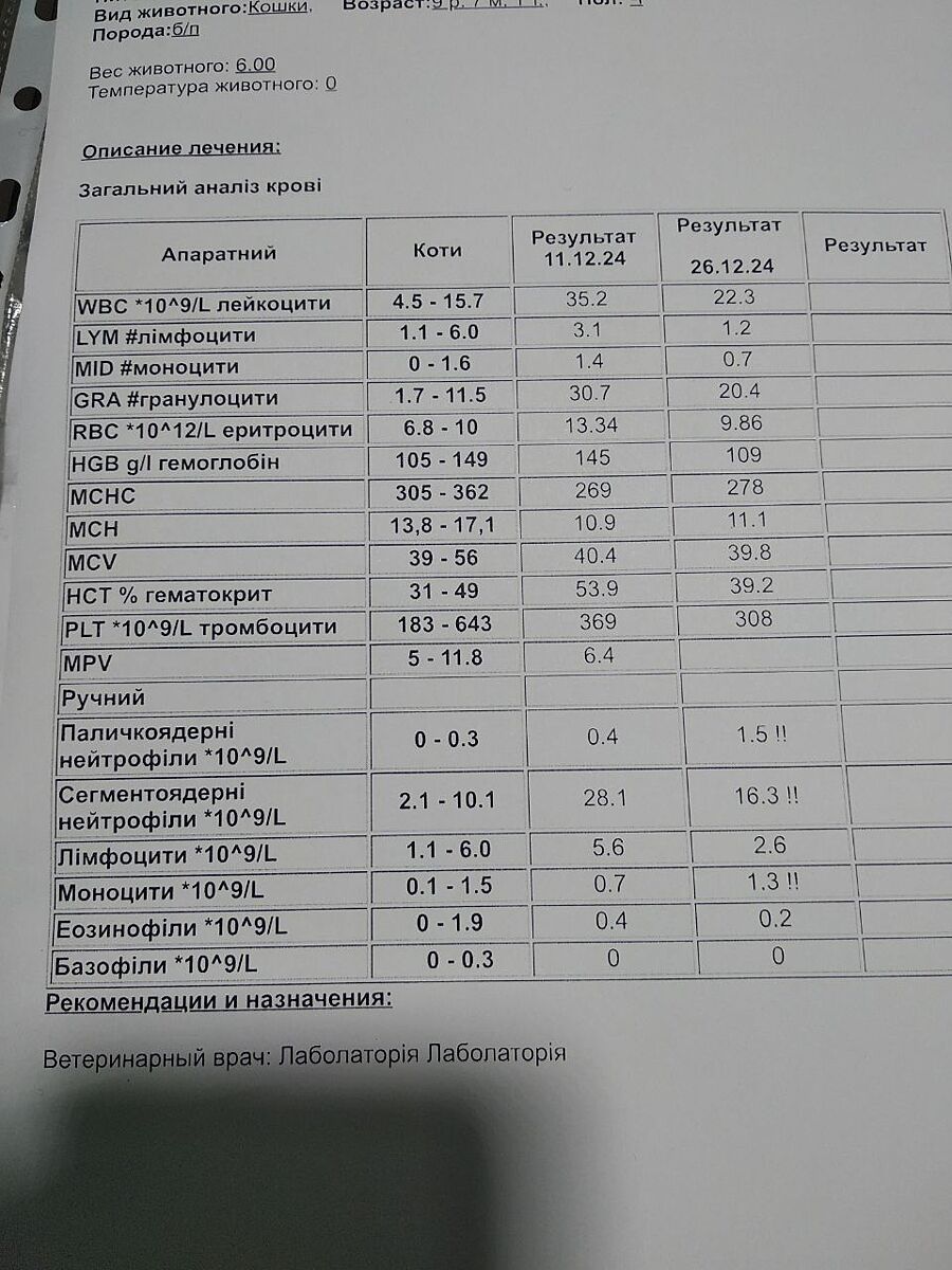 На второй день после отмены Фармазин: новое состояние: сначала его как будто сильно знобило всего после ходьбы, потом я поняла, что это болела задняя лапка. В комнате постоянно +20. Когда засыпал, тремор проходил. 4капли мелоксивет, после каплей тремор прошел, но не мог стать и на переднюю лапу, 40.1. Анализы на фото. За 15дней минус 1кг, лейкоциты ниже но высокие. Смотрели ещё мочу, это не описали, в норме. Назначил энроксил, всё. Начинаю давать, вижу всё равно не лечу, не мой кот. На второй-третий день Энроксил ест плохо, воду не пьёт, много спит, но активность проявляет. На 4й день энроксил ест хорошо, воду пьёт, играет, лёгкого тремора нет около двух дней. Очень сильный тремор был после отмены Фармазин, настолько сильный не повторялся, прошел после Мелоксивет. Другая врач дистанционно назначила фамцикловир. На 4й день фамцикловира его состояние в норме, как я вижу, обычное состояние когда он здоров, играет, чем-то интересуется, подвижный. Но обратно на 4й день есть немного как бы дрожь, похожая на нервную, взгляд иногда как будто чем-то напуган. Тест ветэксперт имунодефицит лейкоз негативный. Коту 8лет. Слизыстые розовые, язв нет. Ещё начала давать таблетки с травой от стресса. Мы в селе. Есть другие коты, у кошки начались выделения из глаз после того,как её ударила другая кошка, юнидокс пока даю 4й день, темп.была в норме. Котёнок чихал, фармазин 7дней, всё в норме.