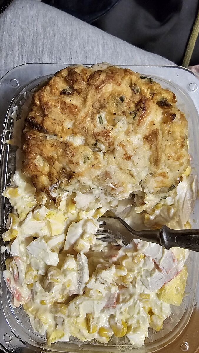 Две столовые ложки утренней жаренной картохи разогретые с яйцами. И пару ложек крабового