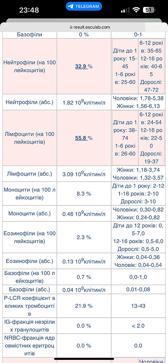 Нейтрофіли 32,9% ( норма 35-65), лімфоцити 55,8%( норма 24-54), ШОЕ 16