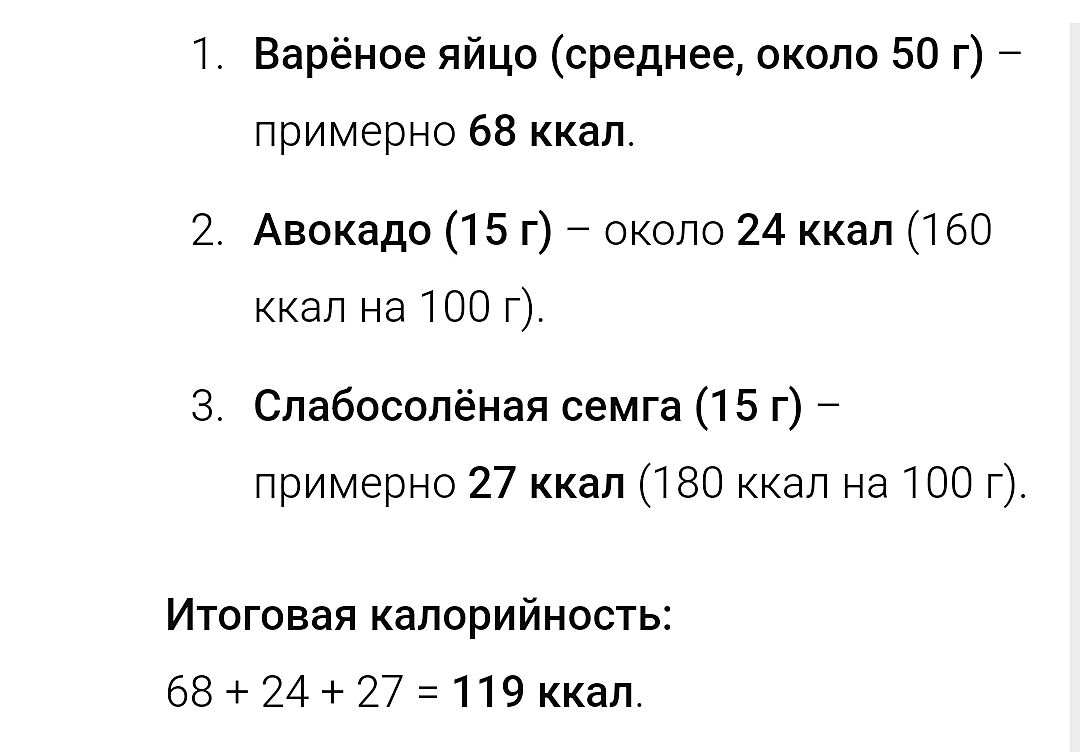 Яйцо 100 ккал, авокадо больше, около 200, а ещё лосось.