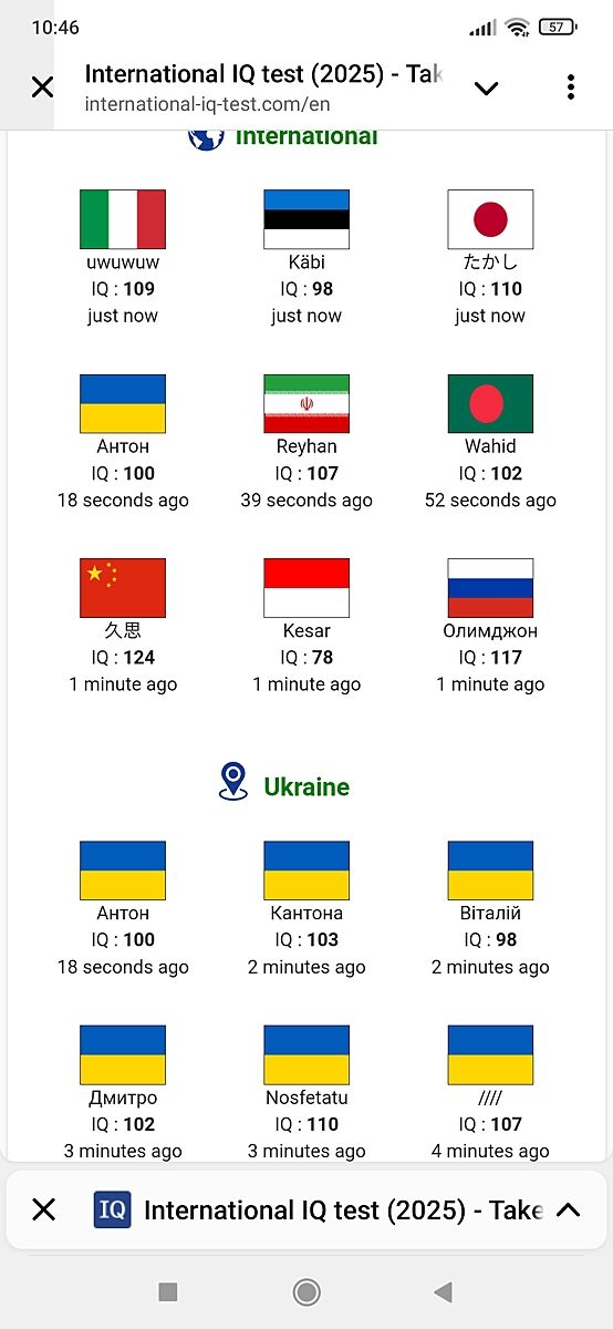 Украина заняла 78-е место в мире по уровню iq. Надо с этим шото делать. Предлагаю всем поднапрячься и показать кто тут ху из ху. Сам честно и добросовестно вчера прошел, за результат не стыдно)