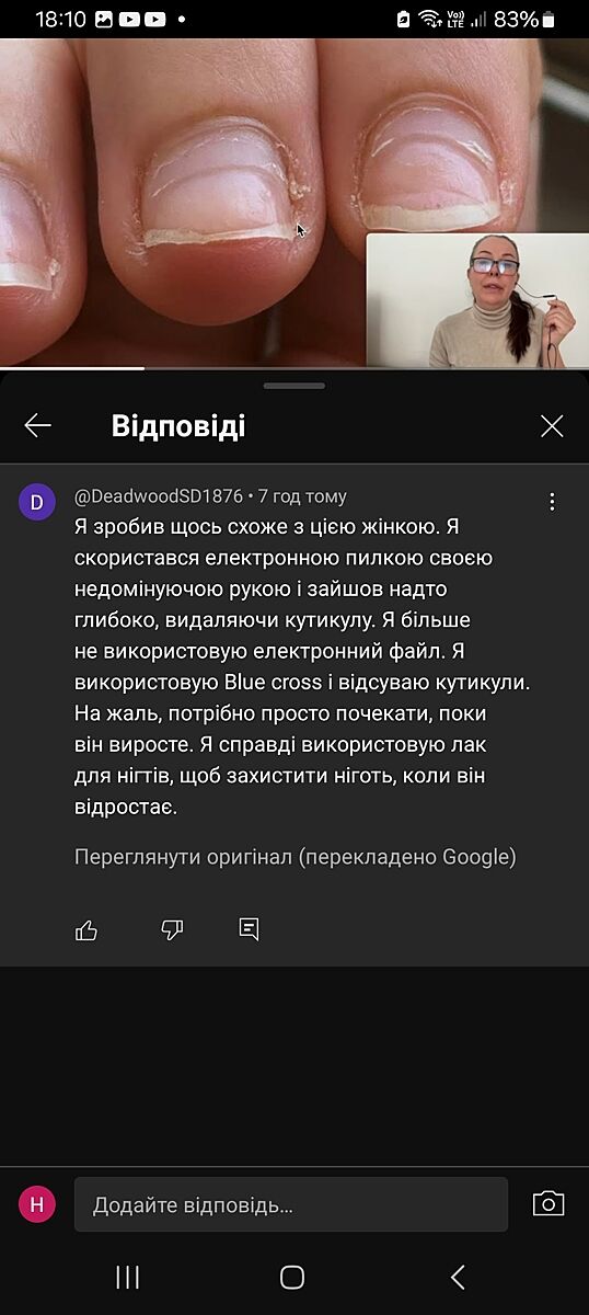 Останнє відео, свіже, я ще не додивилася до кінця, можна вмикати субтитри знайомою мовою, як я знайду відео про покриття звичайним лаком при пошкоджених нігтях, то дам посилання, а взагалі там варто і коменти читати, в перекладі